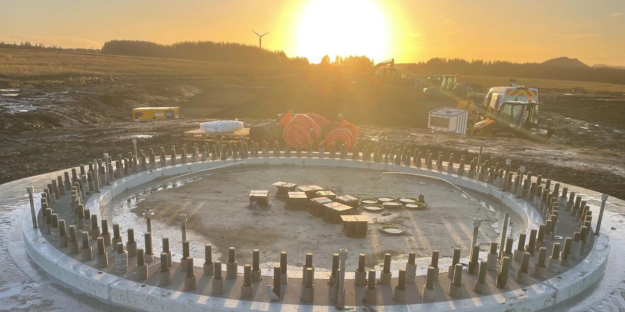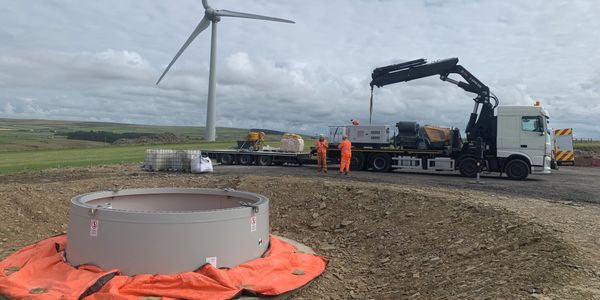 The foundations for onshore wind turbines are made from concrete, however, due to the large, dynamic forces associated with a tall steel turbine on concrete base, a special, high-strength grout is injected to the connection of the concrete and steel flange of the turbines tower to absorb these forces and provide a solid base over its service life.